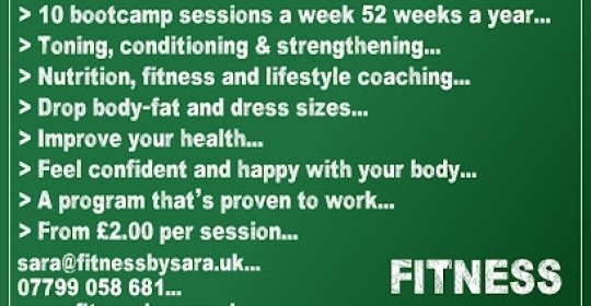 Fantastic experience: Fitness by Sara is great. Love her boot camp classes. She has really helped me achieve my goals and is always super friendly. Would definitely recommend her to friend and family.